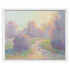 Awash in pastel tones, the scene presents a tranquil landscape imbued with a soft, ethereal glow. The gentle fusion of purples and yellows creates a soothing atmosphere, reminiscent of Impressionist influences, where light and color play across the setting. Delicate brushstrokes form a pathway winding through lush foliage, embodying the essence of a serene morning. The sun, pale and tender in the sky, adds warmth that contrasts with the cool, misty environment. This artwork subtly reflects contemporary appreciation for natural beauty while prompting the audience to consider the allure of atmospheric landscapes in today's fast-paced world.