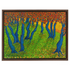 This vibrant artwork depicts a whimsical forest scene, characterized by striking blue, curved tree trunks that create a dynamic and surreal effect. The dense canopy of orange and red leaves contrasts vividly with the blue trunks, evoking the warmth of autumn. The forest floor is a lush, textured green, dotted with small orange and red accents, suggesting fallen leaves or blooming flowers. In the background, a glowing gradient of yellow and orange suggests the soft light of a sunset or sunrise, adding warmth and depth to the composition. The bold colors and exaggerated forms lend the piece an expressive, imaginative quality, blending elements of impressionism and expressionism to bring the natural landscape to life. The artist’s signature in the bottom corner provides a personal touch and marks the year of its creation.