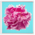 The image displays a close-up of a peony, predominantly featuring shades of pink to peach, with visible yellow stamen at the center. The petals appear vibrant and exhibit details such as slight folds, contributing to the flower's full bloom character. The background is designed with hues of light blue to turquoise, providing a contrasting backdrop that accentuates the peony and enhances its bright and warm appearance.