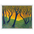 A golden sunset bathes the horizon, casting a warm glow that transforms the landscape into a serene spectacle. Dark, flowing tree trunks rise from a lush carpet of grass, their branches adorned with scattered leaves that create an intricate play of light. The contrasting elements provide a feeling of dimensionality, immersing the viewer in a scene where nature and light engage in delicate balance. Tiny white blooms dot the foreground, adding a subtle touch of life to the tranquil setting. This work examines the relationship between nature and color, prompting thought about how these elements reflect broader cultural themes concerning the environment and our role within it.