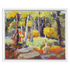 What does the forest tell when drenched in golden hues of autumn? This work immerses the viewer in a rich display of nature’s textures and colors. The artist skillfully employs thick, expressive brushstrokes, bringing life to the rough surfaces of trees and fluttering leaves that catch the light. Lush greens, warm yellows, and fiery reds contrast against deep, earthy shadows, creating a visual feast for the imagination. This depiction captures the essence of nature’s seasonal transformation. The variation of color and form culminates in an enchanting scene that leaves an enduring impression of beauty and tranquility.